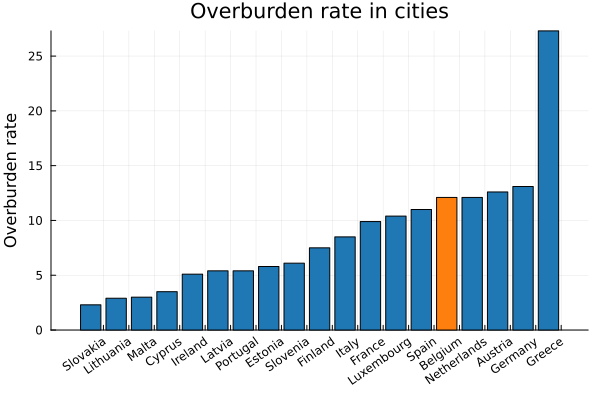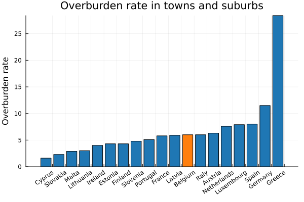 So the question is, how do more expensive houses compare higher salaries? How possible is it to work your way towards houses in a nicer neighborhood, and how does that compare to other countries? That data is not readily available, but EUROSTAT does provide a measure of overburden rate by degree of urbanisation. A household is overburdened when more than 40% of their disposable income is spent on housing.